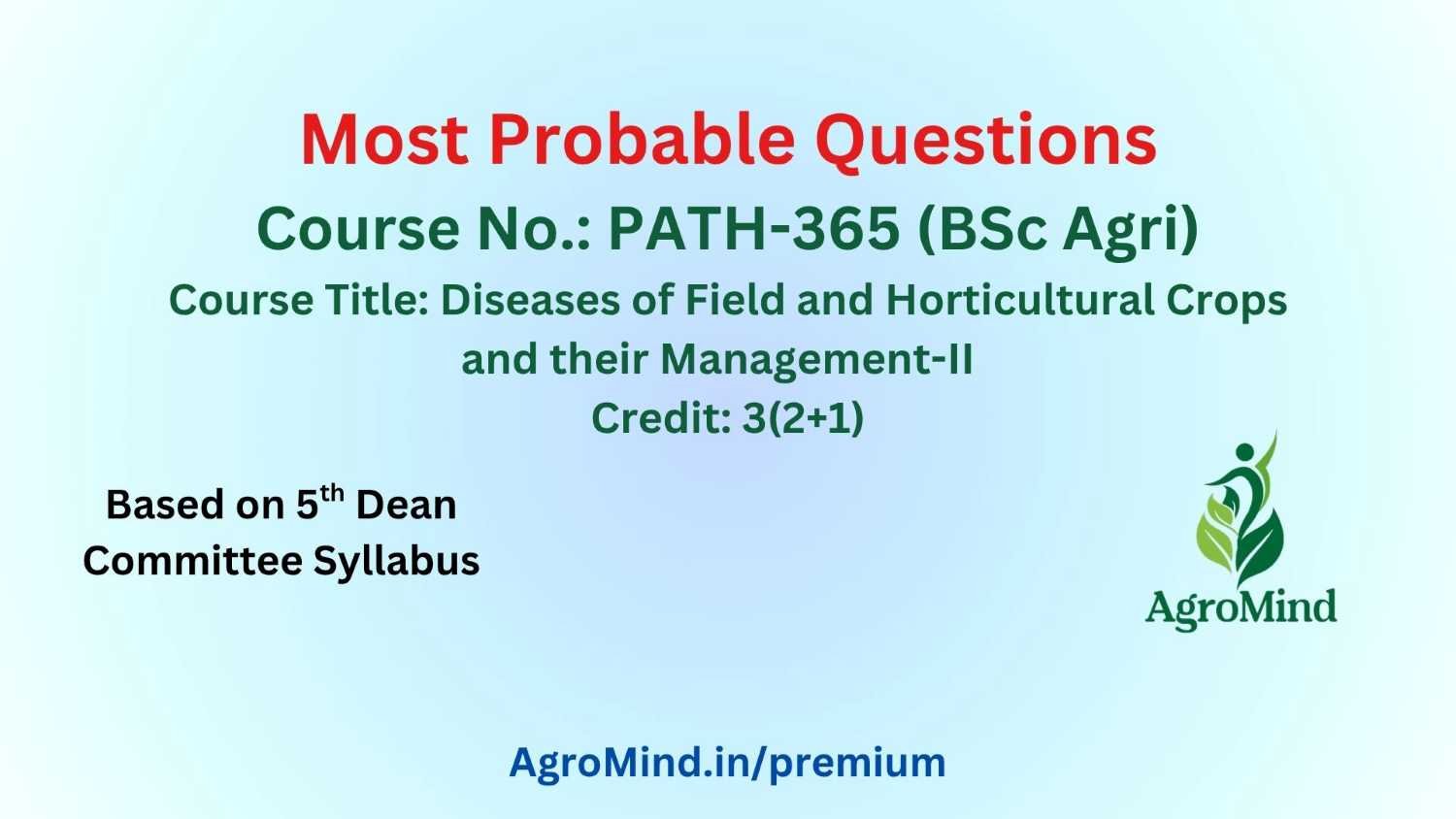 PATH-365 (Diseases of Field and Horticultural Crops and their Management-II) Most Probable Questions are based on analysis of Previous Year Question and 5th Dean Committee Syllabus.